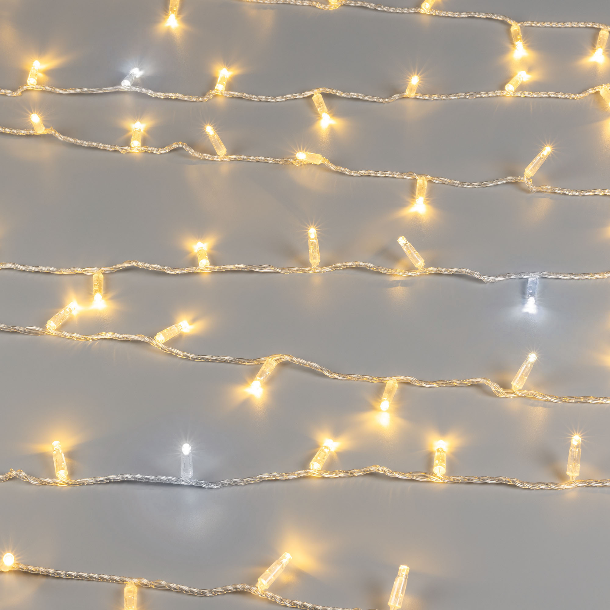 Светодиодная нить Classic. Размер 10000 мм. 100 светодиодов размером 7 мм. Основной цвет свечения ТЕПЛЫЙ БЕЛЫЙ (3000 К), эффект мерцания редких точек (БЕЛЫЙ 6000К) с резким световым рисунком (прозрачная вогнутая линза), соотношение светодиодов: 84 теплых постоянного свечения / 16 белых с мерцанием. Эффект частого мерцания. Провод прозрачный, ПВХ. Питание 230 В, Мощность 7 Вт, защита IP65, применение в помещении и на улице под навесом. Аксессуар для подключения приобретается отдельно.