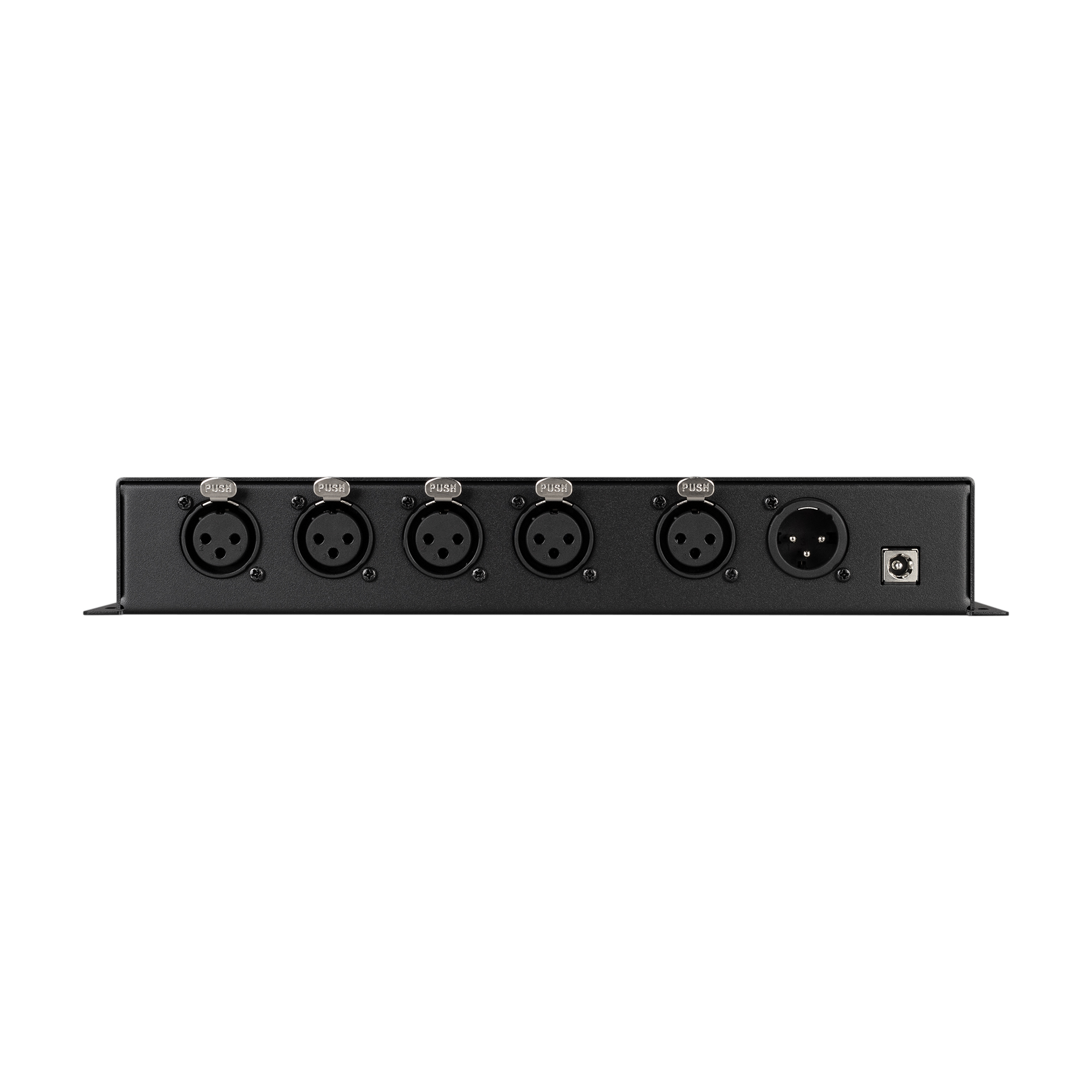 DMX-сплиттер предназначен для распределения DMX512 сигнала и увеличения количества DMX приемников, подключаемых к одному контроллеру. Устройство позволяет распределять сигнал от одного источника на 4 линии. Максимум по 32 приемника на каждой линии. Сплиттер дает возможность создавать DMX сети с древовидной структурой путем объединения нескольких сплиттеров. Способствует увеличению дальности передачи сигнала при установке в середине линии. Оптическая развязка между входом и всеми выходами снижает уровень помех на шинах DMX512 и уменьшает верятность выходя из строя оборудования при попадании высокого напряжения на шину. Устройство оснащено терминальными клеммами и разъемом XLR3, обеспечивающим трансляцию сигнала DMX512 на вход/выход. Питание устройства имеет диапазон напряжений от 12В до 36В, 4 выходных канала DMX512. Габариты сплиттера составляют 256х92х38 мм, металлический корпус чёрного цвета.