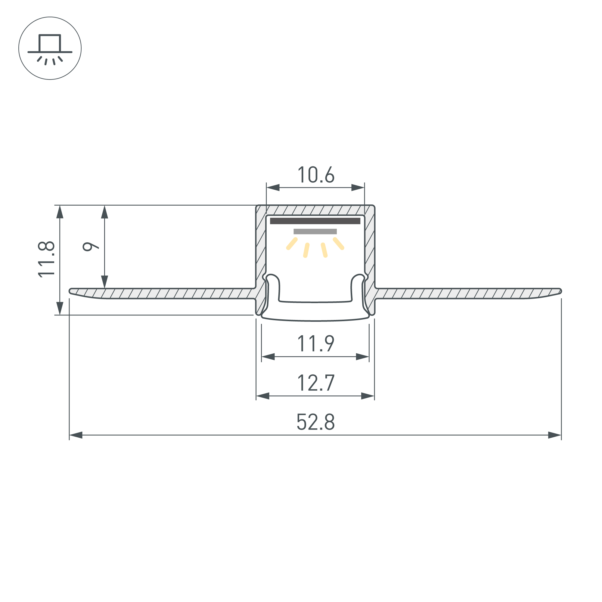 Габаритные размеры профиля составляют 2000 мм в длину, 52,8 мм в ширину и 11,8 мм в высоту. Площадка для установки светодиодных лент позволяет использовать ленту шириной до 10,6 мм и мощностью до 16 Вт/м. Это обеспечивает гибкость в выборе светодиодных лент и создает потрясающие световые решения.