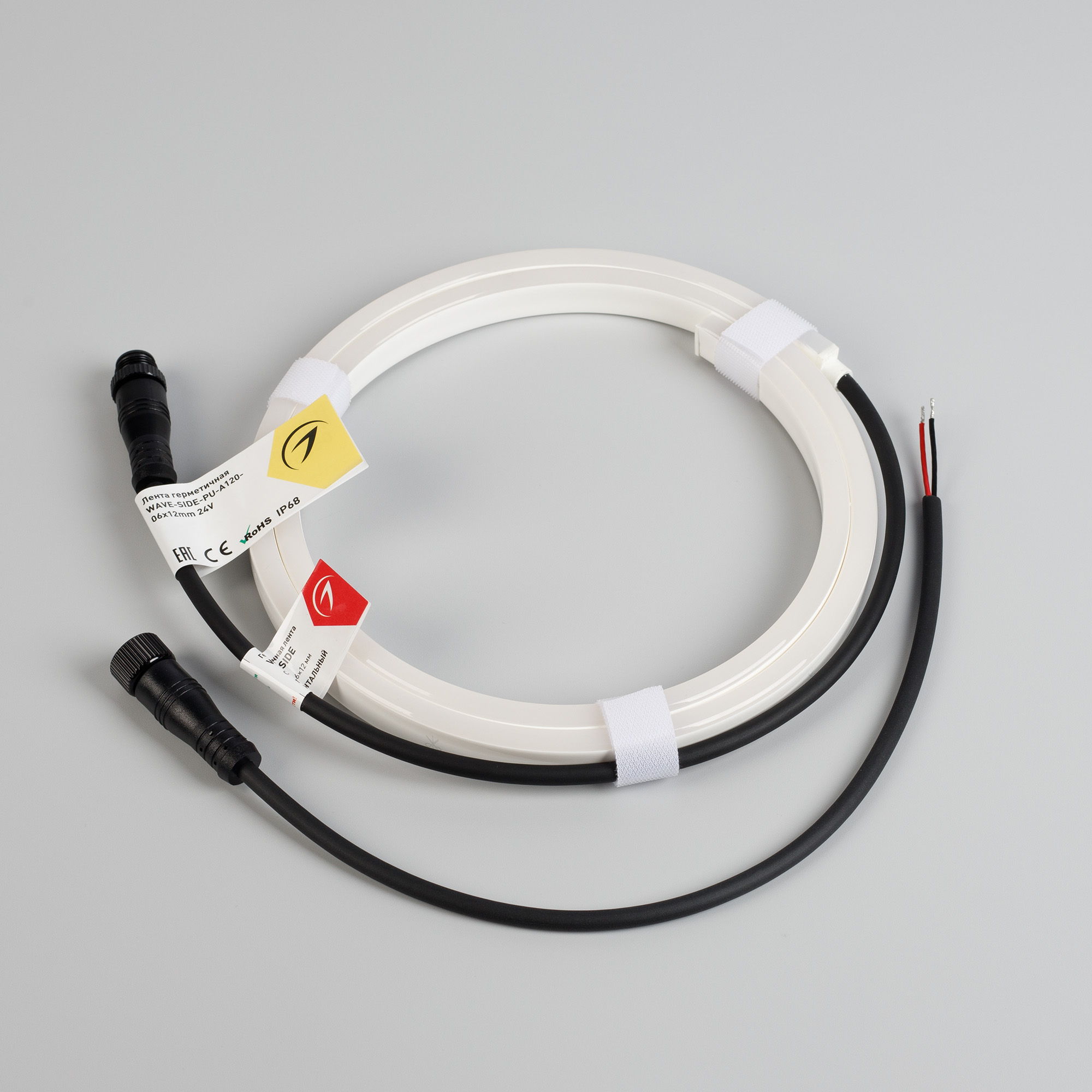Гибкая герметичная лента (неон серии WAVE), сечение 06×12 мм. Светодиоды SMD2835 120 шт/м. Цвет свечения ТЕПЛЫЙ БЕЛЫЙ (2700 K), индекс цветопередачи CRI>90, световой поток 384 лм/м, угол излучения 125°. Мощность 8 Вт/м, питание 24 В. Оболочка из Полиуретана (PU). Класс пылевлагозащиты IP68. Размеры 1000×06×12 мм. Не подлежит резке. Горизонтальный изгиб SIDE, минимальный радиус изгиба 30 мм. Катушка 1 м. Цена за 1 м. Гарантия 3 года.