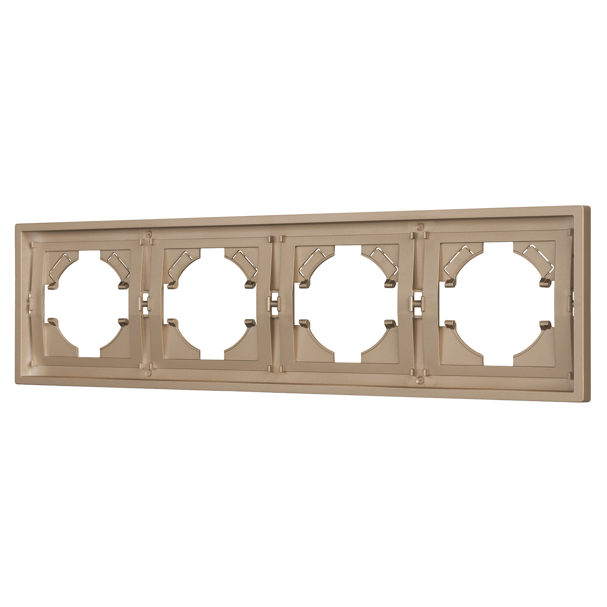 Рамка пластиковая на 4 поста, под встраиваемый механизм. Цвет - золотой. Среднего уровня герметичности IP20. Ориентация монтажа горизонтальная. Габаритные размеры: длина 294 мм, ширина 80 мм, высота 9 мм. Гарантийный срок 12 мес.