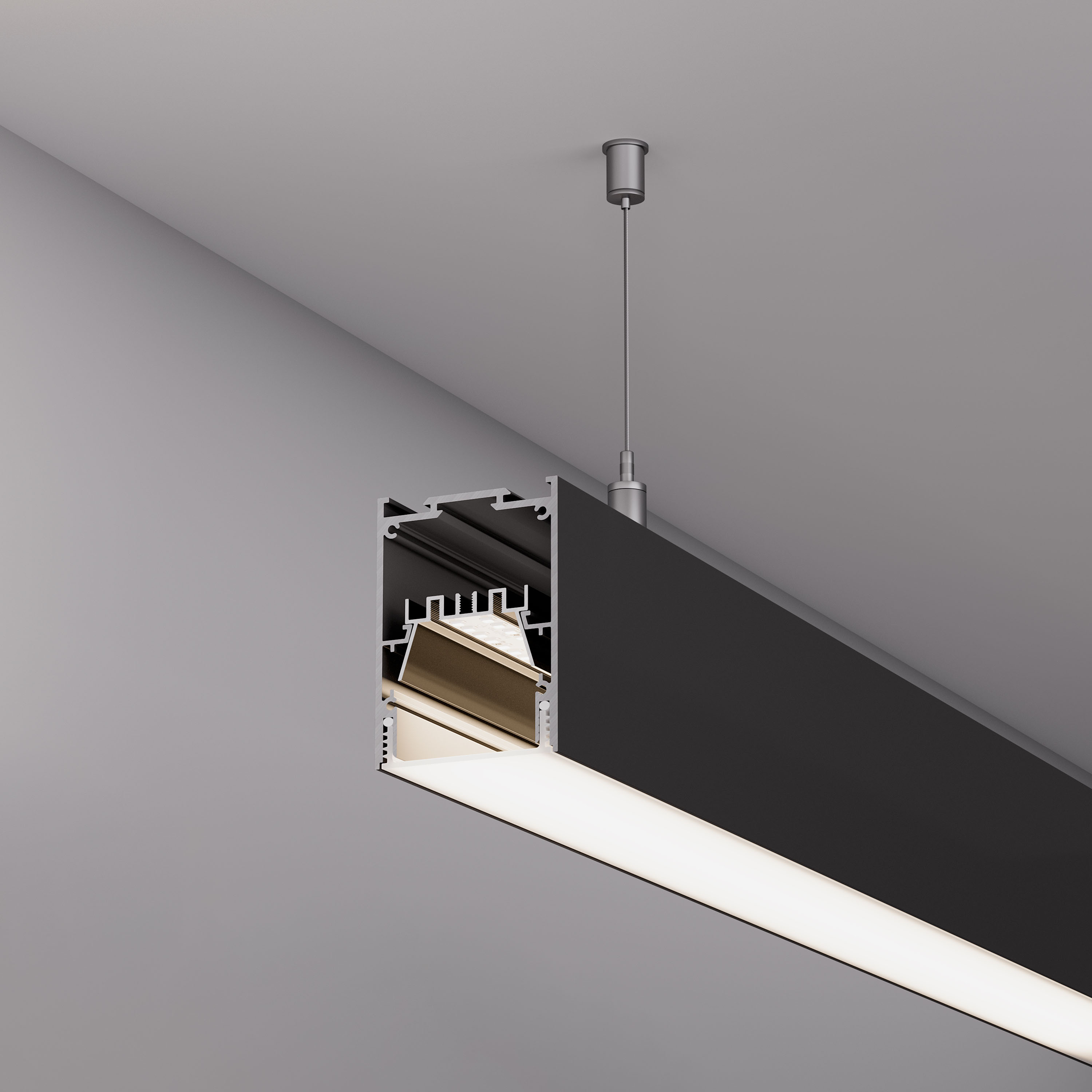 Подвесной профиль из алюминия черного цвета для основного освещения с возможностью герметизации до IP54 с помощью аксессуаров к профилю без дополнительного использования силиконового герметика, до IP65 с помощью аксессуаров к профилю при условии дополнительного использования силиконового герметика. Габаритные размеры профиля составляют 2000 мм в длину, 54,25 мм в ширину и 75 мм в высоту. Площадка для установки светодиодных лент позволяет использовать ленту шириной до 16 мм и мощностью до 36 Вт/м.