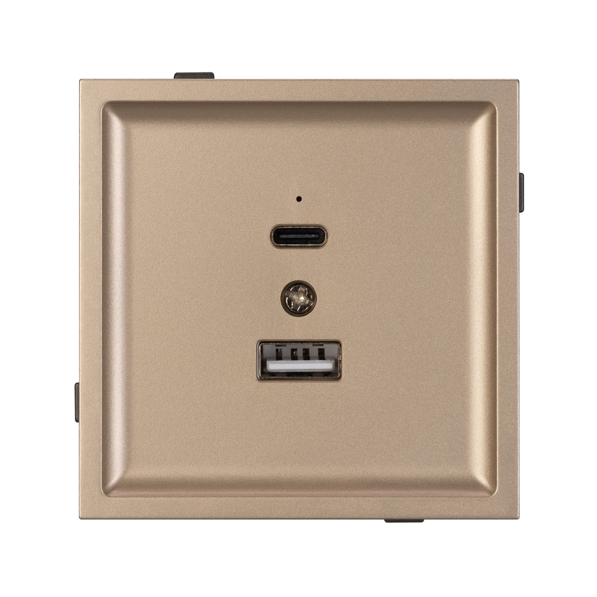 Механизм USB розетки на 2 порта Type A + Type C. Цвет - золотой. Без фронтальной рамки. Выходная мощность для USB Type C порта не превышает 20W. Уровень пылевлагозащиты IP20. Устанавливается в стандартный подрозетник круглого сечения диаметром 60мм. Габаритные размеры: длина 71 мм, ширина 71 мм, высота 42 мм. Гарантийный срок 10 лет.