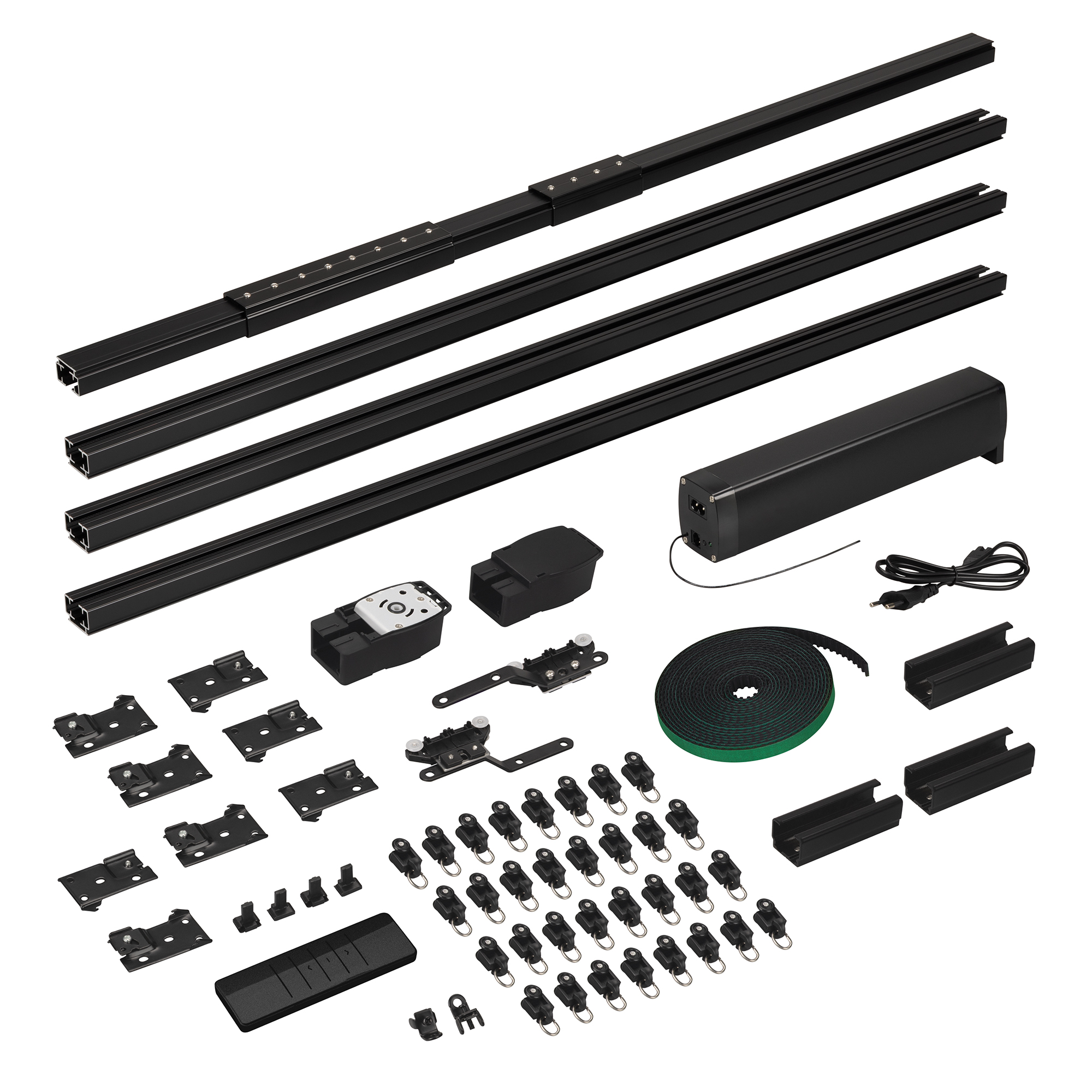 Полный комплект черного электрокарниза из металлического профиля с мотором. Готовое решение для установки карниза, который будет управляться дистанционно пультом, с помощью приложения на телефоне, голосовым помощником, либо вручную. Возможность выбора нужной длины благодаря наборным частям.