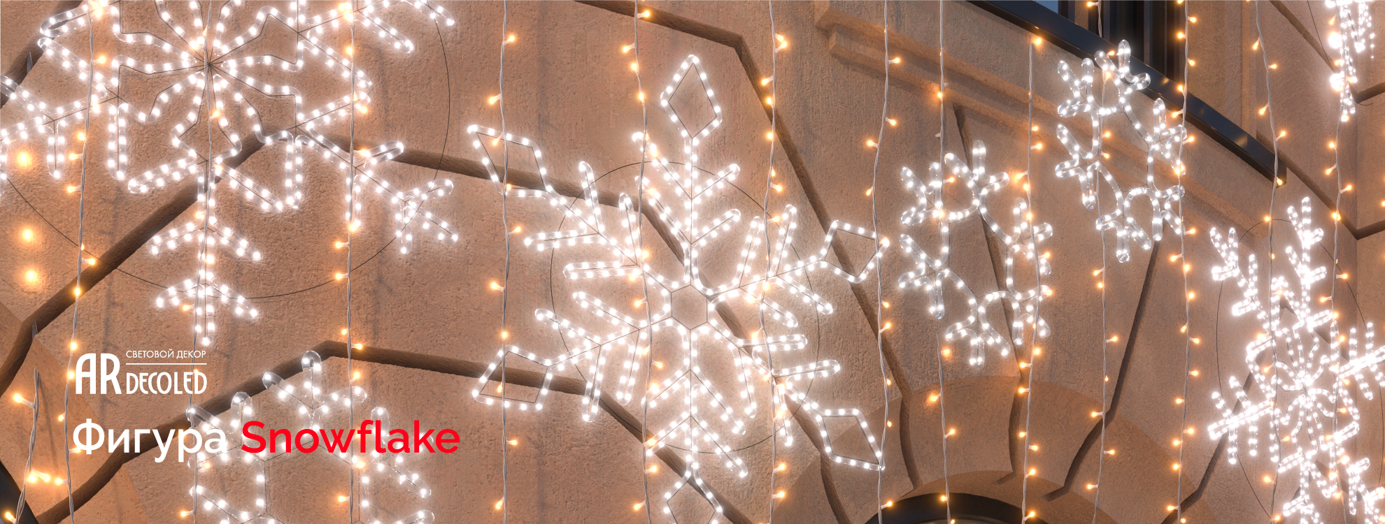 Двухмерные фигуры «Снежинка» из дюралайта помогут создать праздничное настроение в интерьере кафе или магазинов, а также на фасадах зданий и верандах под навесом.
