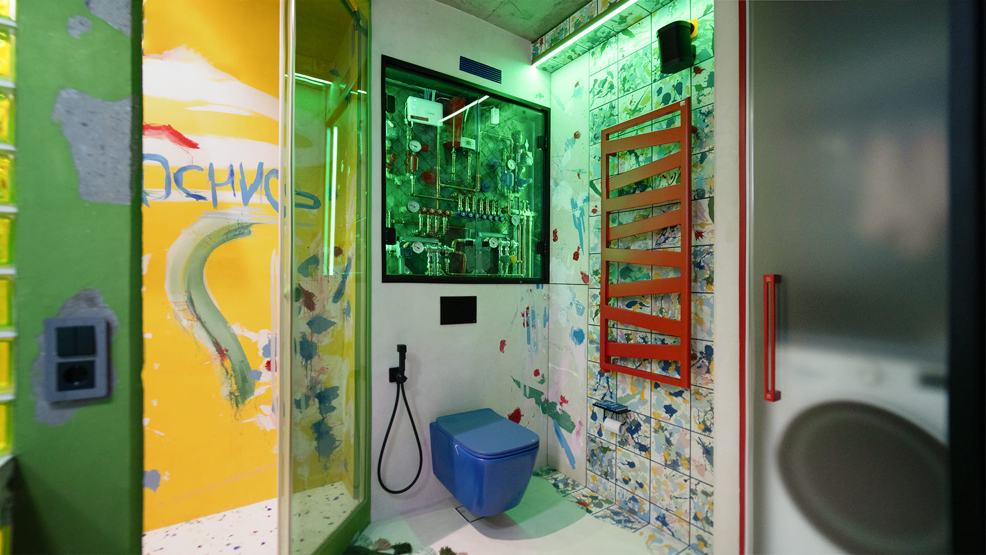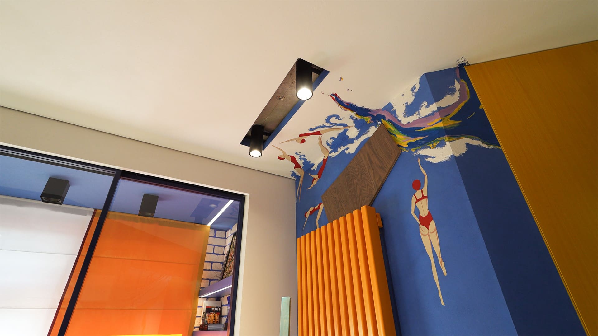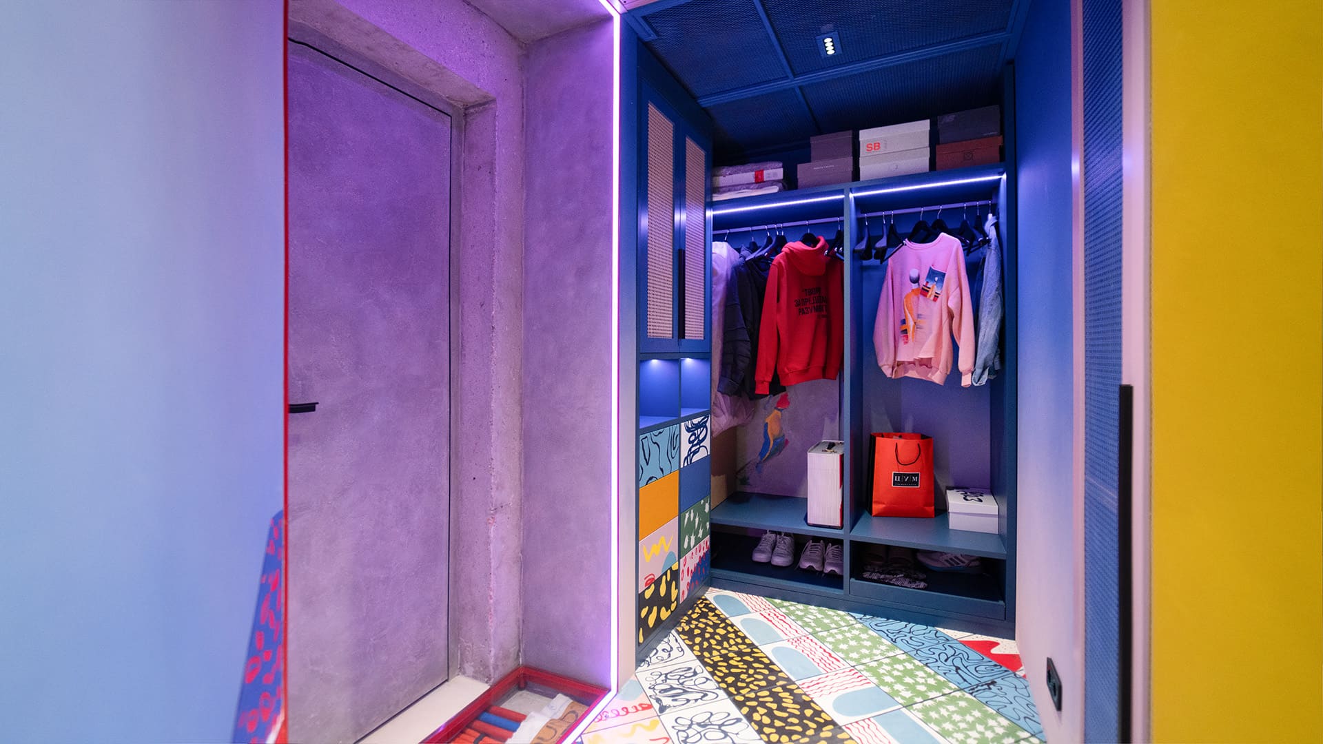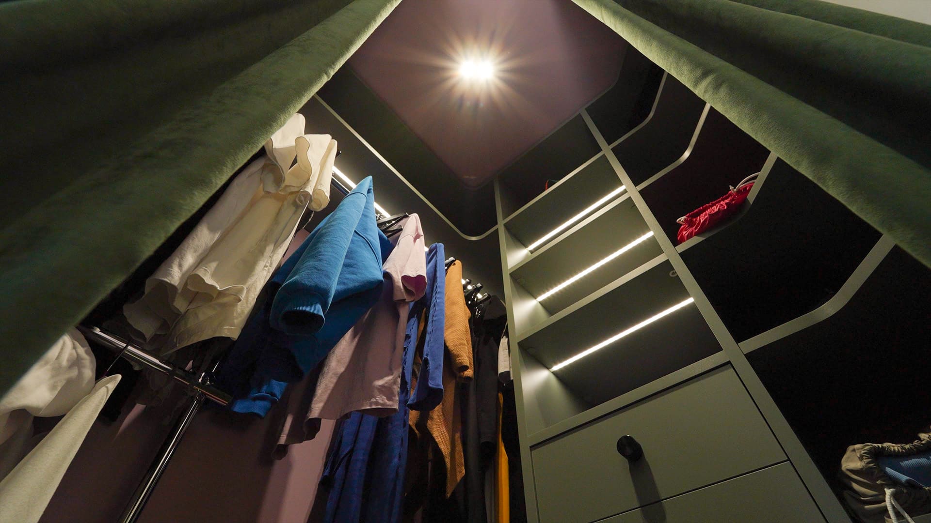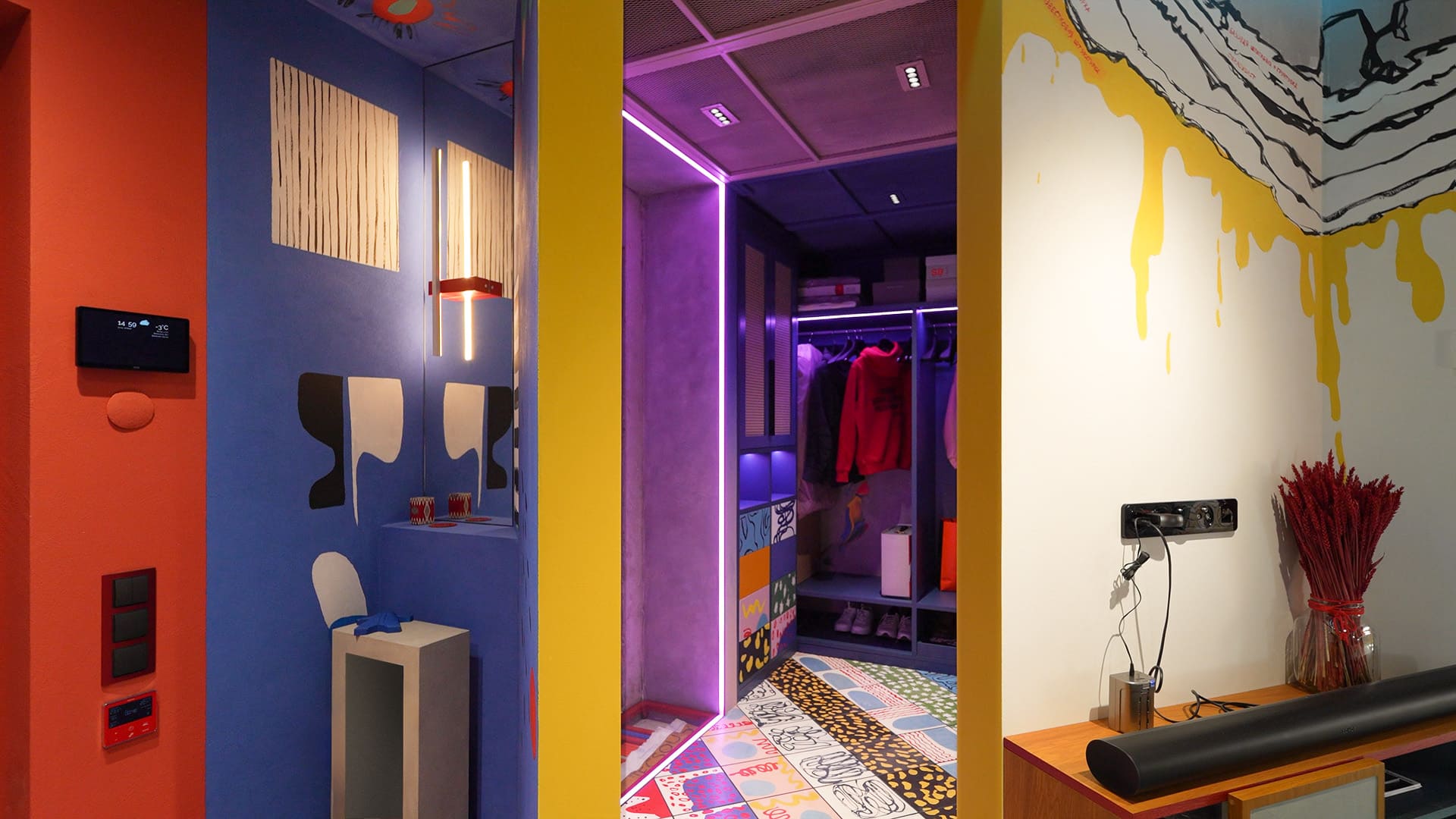 Особое внимание уделено освещению: все светильники в квартире, даже встроенные, оснащены регулируемыми модулями, которые позволяют направлять свет именно туда, где это необходимо. А светодиодные RGBW-ленты добавляют яркие акценты и создают настроение, подчеркивая красоту цветного интерьера.