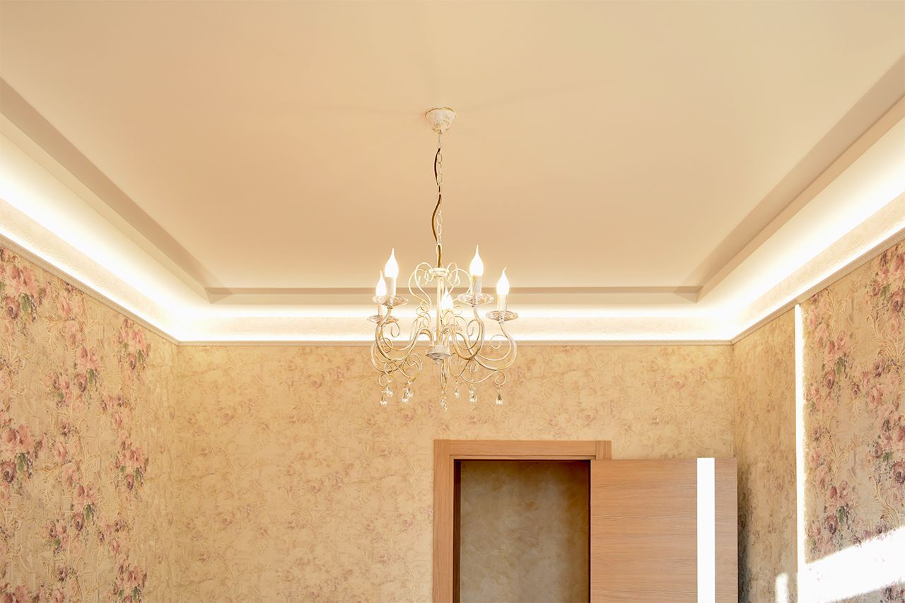 Дополнительное светодиодное освещение в многоуровневом потолке из гипсокартона. Зонирование помещения вертикальными линиями света.