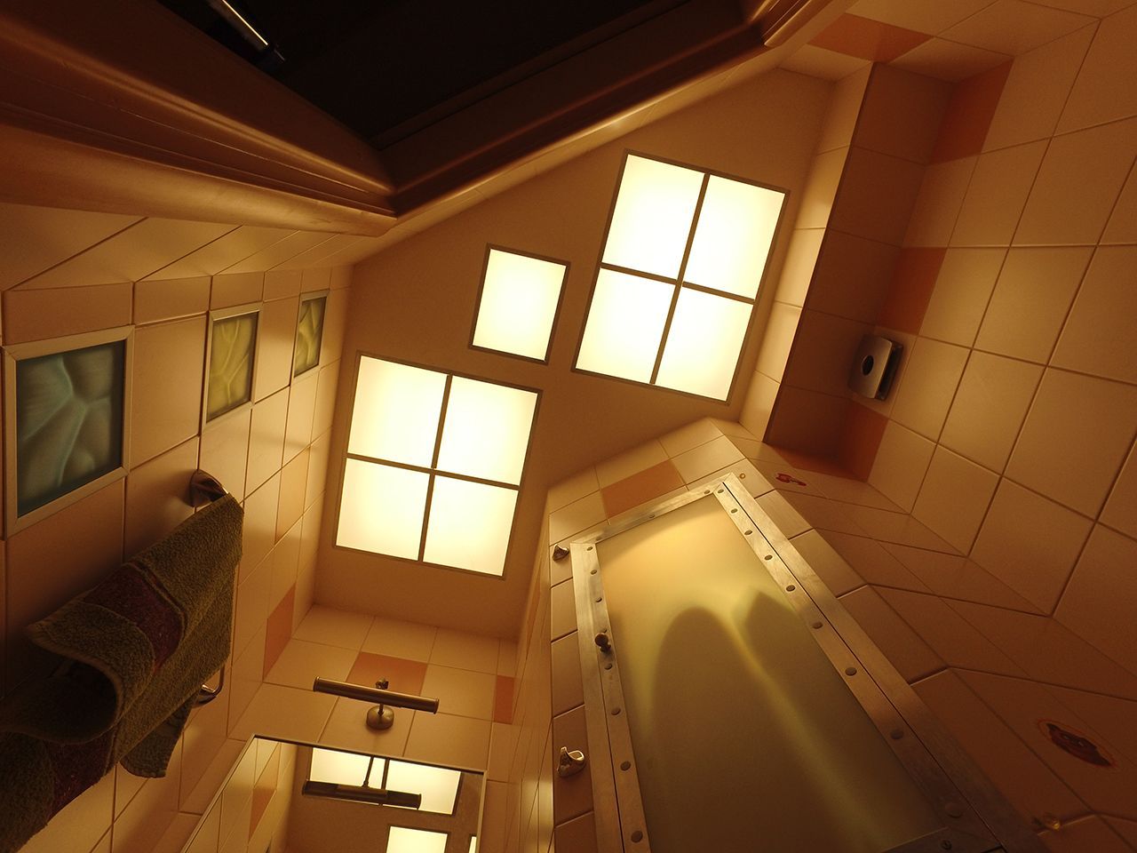 Освещение ванной реализовано при помощи квадратных светильников, встроенных в потолок. Стёкла-рассеиватели были сняты, люминесцентные лампы и проводка демонтированы. Затем специалисты рассчитали оптимальное расстояние между светодиодной лентой и стеклом, чтобы получить равномерную засветку. Ленту установили в соответствии с расчётами, закрыли рассеивателями и получили равномерно светящиеся квадраты.