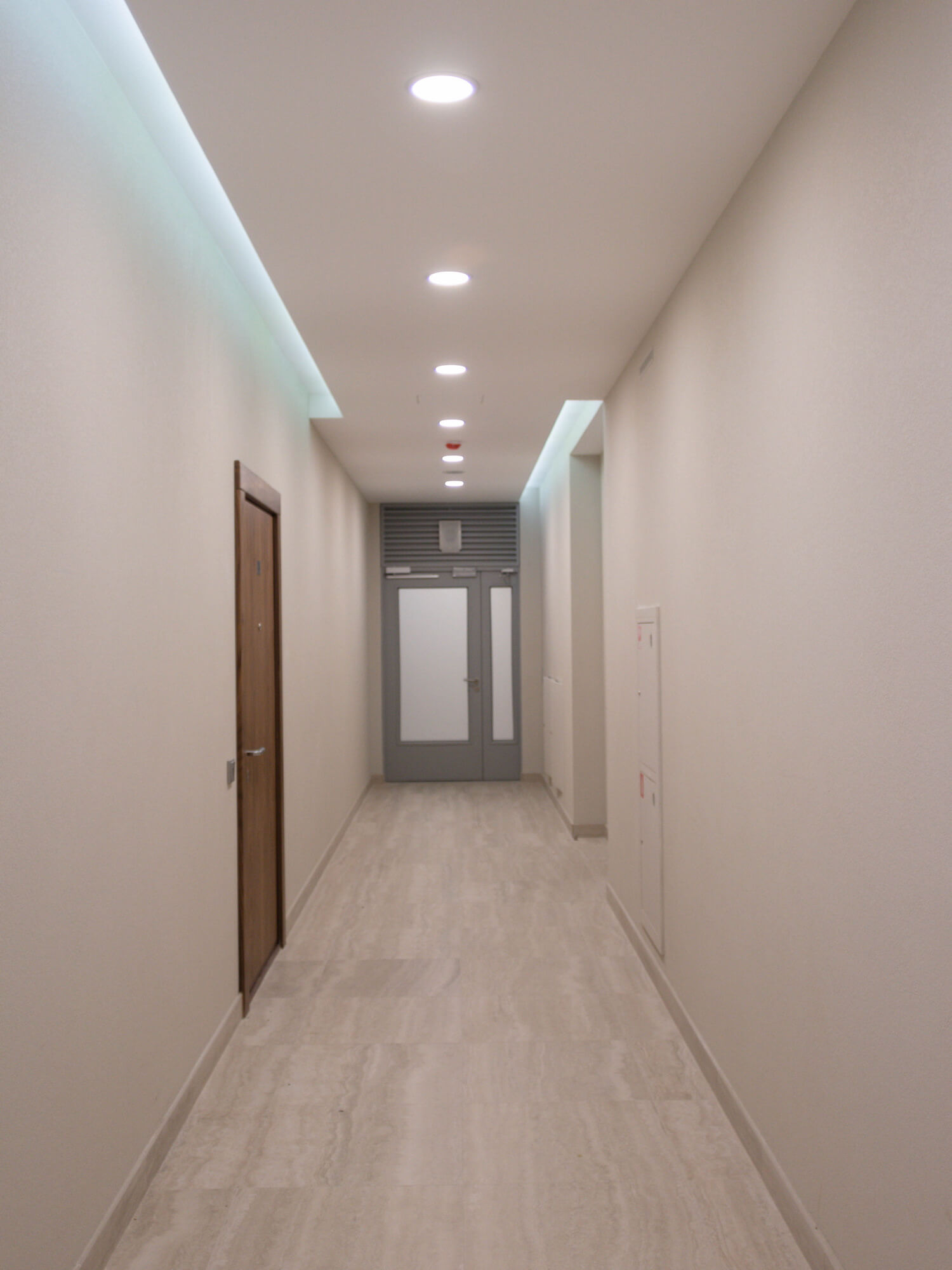 В лаконичных интерьерах лаунж-студий аккуратно и стильно смотрятся накладные круглые и подвесные линейные светильники. Они не только обеспечивают хороший уровень освещенности, но и выглядят как оригинальный элемент интерьера. Для подсветки потолка использована светодиодная лента, которая проходит по его границе плавными изгибами и добавляет пространству интересных световых деталей.